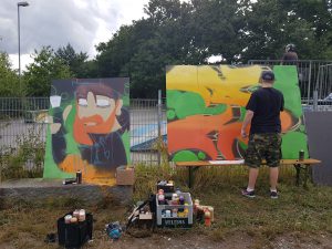 Jeder war eingeladen dem Publikum sein Können auf der Anlage zu zeigen, zwei Sprayer zeigten was man mit ein paar Dosen Farbe und einer passenden Fläche anstellen kann und auch für Musik und eine kleine Bühne war gesorgt. Dazu gab es gegen einen kleinen Obulus auch Würstchen vom Grill und kühle Getränke.