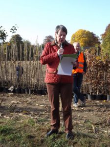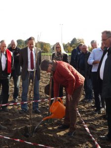 Bei herrlichem Sonnenschein ging es dann zur Pflanzung der Ehrenbäume. Neben dem Baum der Gemeinde und einem weiteren Baum, der alle Baumpaten repräsentieren soll, pflanzte Barbara Hendricks unter fachkundiger Beobachtung von Georg Rumi und Thomas Jäger für den OV-Vorstand, Gottfried Optenplatz für die Ratsfraktion, Kreistagsmitglied Udo Rosowski und MdB Udo Schiefner den ‚Bundes-Baum‘, eine Stieleiche. Die drei Ehrenbäume werden die zentralen Bäume in der Mitte des künftigen 900-Jahre-Waldes sein, der im Übrigen durch die Laubfarbe der verschiedenen Bäume und Anordnung auf dem Pflanzfeld später von oben die Zahl 900 darstellen wird.